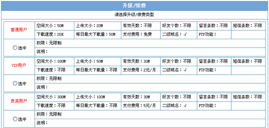 M,空间总共为128M;用户等级为管理员设定的注册等级,每个等级对应着一个空间大小和上传大小,若您升级了空间,此处的等级名称也会不一样;单个文件为您一次上传文件的最大大小;有效期为此等级对应的最长使用截至日期,超过此日期则不能再使用;请随时注意您的使用空间情况 |